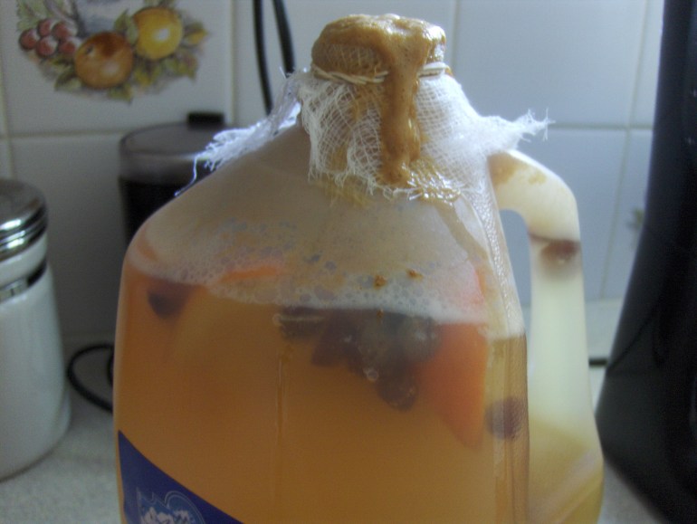 Meanwhile, fill your gallon jug about half full with water and add your 3 lbs. of honey. Put the lid on tightly and shake until all the honey is dissolved and the whole thing is frothy. Remember, you want to get oxygen all through the must so the yeast can begin fermentation. Then, fill the jug the rest of way with water, leaving enough space to add your rehydrated yeast. This is the time to take a hydrometer reading. You can float the hydrometer in your jug, but it can be hard to read or retrieve. They make test jars designed to hold samples of your wine and allow for measurements with a hydrometer. Write down the gravity reading. It should be something close to 1.100, and this becomes your original gravity (O.G.). When fermentation is complete, you can use a formula subtracting your final gravity (F.G.) from your OG which will compute your alcohol by volume (ABV). If you are going to take a pH reading, now is the time. I use a few drops of the must from the hydrometer to take the reading. That way, nothing actually touches my must (this is especially important if you are using test strips). Once the gravity and pH measures are taken, add your yeast, cap and shake well again. Leave loosely covered and put in a safe place. Clean the kitchen and mop the floor, because if you are anything like me, there are sticky spots everywhere. There is no need to put the airlock on right away – in fact it is probably better if you don’t because you want the yeast to get plenty of oxygen. Some people never airlock the primary fermentation vessel. I put on the airlock after 4 or 5 days just to make sure it is covered once the fermentation starts to slow.